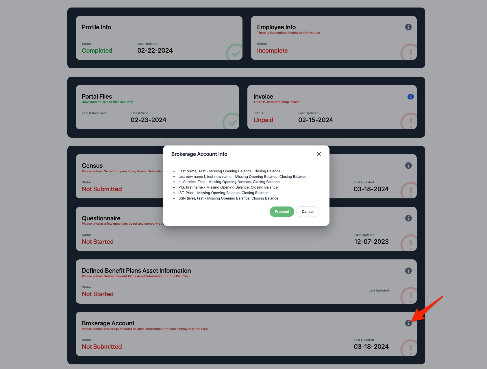 Clicking on the 'i' icon will bring up a list of missing brokerage information.